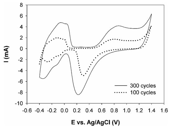 In this study, the oxygen absorption method was used to determine the real surface area of the platinum-modified electrodes. The area under the platinum oxide peak in the CV scan was determined using the automatic peak search option on the potentiostat. The real surface area (cm2) of the modified electrode was determined by dividing the area un-der the oxide reduction peak (μC) by a correction factor of 420 μC cm−2 for a platinum electrode [27]. The surface roughness factor (rf) was then calculated by dividing the real surface area (cm2) by the geometric area (cm2). The electrode subjected to 100 cycles produced a rf of 235, while the electrode cycled 300 times created a rf of 612.