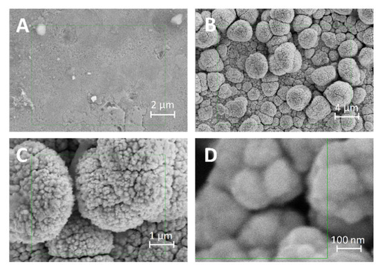 Scanning electron microscopy analysis was performed to determine the surface morphology characteristics of the electrode. Figure 3 depicts the FE-SEM images of the surface of the electrode before modification (A) and at different magnifications of the modification (B, C and D). The SEM image of the unmodified gold substrate displays a flat morphology with some ridges and pits (Figure 3A). The SEM image of the nanoporous platinum modified electrode (Figure 3B) shows well-dispersed, spherical platinum clusters with an approximate size of 2 µm. Detailed images at higher magnification of the modified electrode are shown in Figure 3C,D. The platinum clusters contained nanopores of approximately 10 to 20 nm in size, which can be clearly observed in Figure 3D.