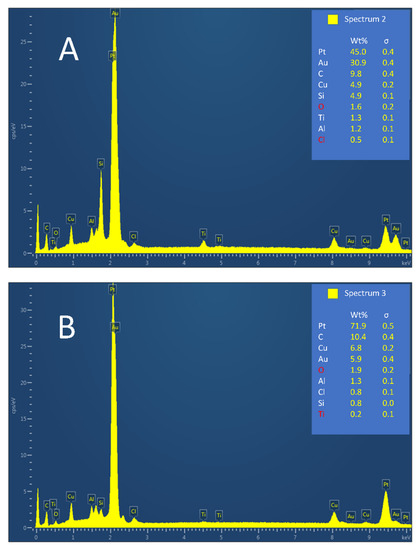 The chemical composition of the nanoporous platinum layer was determined by energy-dispersive X-ray spectroscopy (EDX) (Figure 4). Figure 4A shows the spectrum obtained from the electrode that was subjected to 100 deposition cycles, while Figure 4B shows the results from the electrode that had undergone 300 deposition cycles. Both EDX spectra of the nanoporous platinum layer confirm the presence of platinum as the element of the highest percentage weight. Increased deposition cycles in Figure 4B produced an increase in Pt signal (45.0 to 71.9%), which, consequently, led to a reduction in the Si signal (4.9 to 0.8%) from the MPTS. This confirms that with increasing deposition cycles, the platinum percentage weight increased and the available MPTS attachment sites decreased as they were continuously being occupied by platinum. The Au signal was due to the gold substrate on which the platinum was deposited. Other elements appearing in the EDX spectrum were Cu, coming from the residual copper after the dealloying process, and O and C, which were present due to the use of MPTS as the organic linker in the fabrication of the electrode.