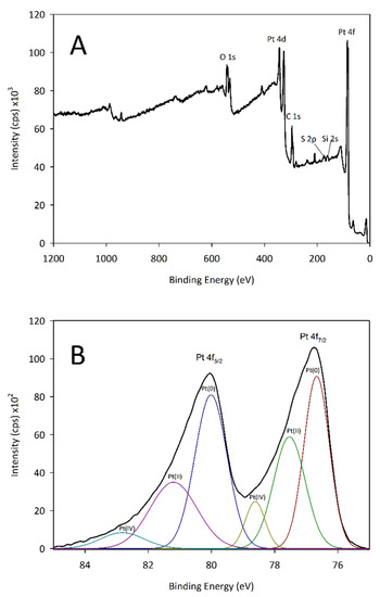 The nanoporous Pt surface was analysed by XPS. Figure 5B shows the high-resolution spectra for Pt 4f. The doublet structure revealed dual components with assigned binding energies at 76.7 eV, 4f7/2 and 79.9 eV, 4f5/2. These increased energies can be associated with charging on the platinum surface and increased final state effects due to the nanoparticle size [29]. Previous studies have also shown that Pt-S bond formation can cause a shift in Pt 4f spectra [30]. This would correspond with the covalent nature of the interaction between platinum and the silane linker.