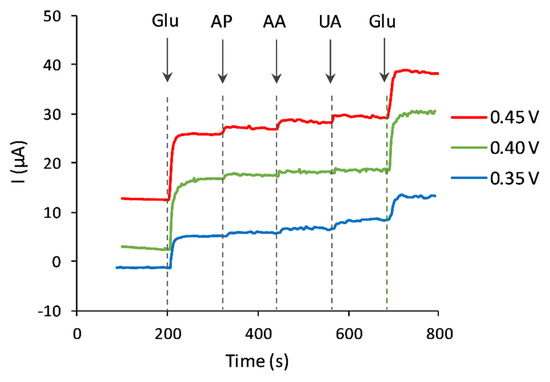 Therefore, the amperometric response of the Au-MPTS-Pt to successive additions of 1 mM glucose, 0.1 mM p-acetamidophenol (AP), 0.1 mM ascorbic acid (AA), 0.1 mM uric acid (UA) and 1 mM glucose (Glu), respectively, in a stirred 0.1 M phosphate buffer (pH 7.4) was investigated. Figure 5 shows the change that occurs in the amperometric response at different potentials. There is a minimal response to interfering species at 0.4 V, with no significant effect on the recovery of glucose, which suggests the anti-interference capability and high selectivity of the Au-MPTS-Pt electrode at this potential.