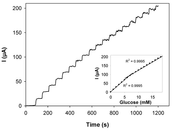 The calibration curve (inset) displays two distinct regions of linearity, similar to the response reported in a number of previous studies [39,40,41,42,43]. The first region provided a linear range from 1 to 7 mM glucose with a regression coefficient of 0.9995 and a sensitivity value of 191.67 µA mM−1 cm−2. The second region displayed a linear range from 7 to 18 mM glucose with a regression coefficient of 0.9995 and sensitivity of 135.98 µA mM−1 cm−2.