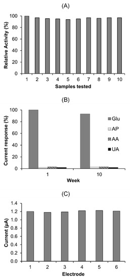 Reusability: Amperometric responses of a Au-MPTS-Pt sensor to ten 1 mM glucose samples in 0.1 M PBS at the applied potential of 0.4 V (A). Stability: Amperometric responses of the Au-MPTS-Pt to additions of 1 mM glucose and 0.1 M interferences in 0.1 M PBS at week 1 and week 10 (B). Reproducibility: Amperometric responses of six independently fabricated Au-MPTS-Pt sensors to additions of 1 mM glucose in 0.1 M PBS (C).