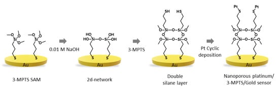 The fabrication of the sensor involved immersing the prepared gold electrode in the MPTS solution. MPTS was chosen in this self-assembly approach as, structurally, it possesses two reactive functional groups—the thiol tail and the methoxy headgroup. The thiol tail allows covalent attachment to the gold surface, while the methoxy group can undergo hydrolysis and condensation reactions [24]. This immersion resulted in the attachment of a self-assembled monolayer of MPTS onto the surface by the formation of Au–S bonds. The electrode was then immersed in 0.01 M NaOH, causing the hydrolysis of the self-assembled monolayer through a polycondensation reaction, forming exposed silane units arranged in a 2-dimensional (2D) network. A second immersion of the electrode into the MPTS solution resulted in the formation of a second silane layer via Si-O-Si bonds, producing a surface containing many exposed thiol moieties. The fabrication process of the sensor is shown in Scheme 1. Chemisorption of a nanoporous platinum surface onto the MPTS 2D network was performed by the electrochemical co-deposition of a platinum–copper alloy and the subsequent electrochemical dealloying of the less noble copper using a previously described method [25]. A platinum–copper layer was deposited during the cathodic scan, while removal of the less noble alloying partner in the return scan yielded a porous platinum structure.