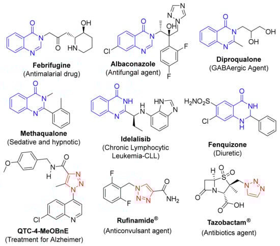 Figure 1. Quinazolinones and 1,2,3-triazoles with pharmacological activities.