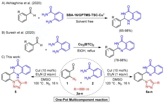 Recently, the use of copper catalysis in the synthesis of quinazolinones has received much attention. An example was reported by Akhlaghinia et al. [17], who described an efficient protocol for the synthesis of 2,3-dihydroquinazolin-4(1H)-ones using Cu(I) functionalized with aminated 3-glycidyloxypropyltrimethoxysilane with thiosemicarbazide [SBA-16/GPTMS-TSC-Cu(I)] as a catalyst in the condensation of 2-aminobenzamide and an aldehyde under solvent-free conditions (Figure 2A). In 2020, Suresh et al. [18] reported the copper-catalyzed oxidative synthesis of quinazolinones in the presence of the reusable catalyst based in Cu3(BTC)2 (BTC = 1,3,5-benzene tricarboxylate) under mild condition, as shown in Figure 2B. There remains, however, a need for in-depth research on the synthesis of highly functionalized quinazolinones from various substrate combinations.