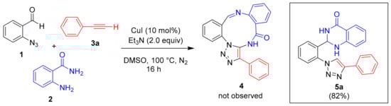 The original objective of this work was the synthesis of ten-membered heterocycles fused to a triazole ring (4), as a continuation of our previous works on the synthesis of medium-sized rings [47]. Thus, aiming to prepare the bicyclic triazole 4, a mixture of 2-azidobenzaldehyde 1 (0.5 mmol), anthranilamide 2 (0.5 mmol) and phenylacetylene 3a (0.5 mmol) in the presence of CuI (10 mol%) as a catalyst and Et3N (2 equivalents) as a base, in DMSO (1.5 mL) and under N2 atmosphere was stirred at 100 °C (Figure 3). However, after 16 h of reaction, the only isolated product was the triazoyl-2,3-dihydroquinazolinone 5a, which was isolated in 82% yield. The structure of 5a was confirmed after fully characterization by high- and low-resolution mass spectrometry, 1H and 13C NMR analysis (data are described in Supplementary Materials).