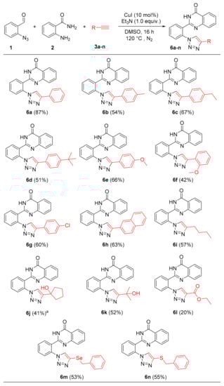 Thus, with the best condition to prepare the triazoylquinazolin-4(3H)-one 6a in hand (Table 1, entry 16), this methodology was expanded to the reaction of 2-azidobenzaldehyde 1 and anthranilamide 2 with a variety of alkyl and aryl terminal alkynes 3a-n (Figure 4).