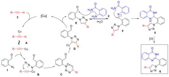 Thus, based on our results, and on studies described in the literature [38,47,48,49,50,51], a plausible mechanism for the multicomponent synthesis of quinazolinones functionalized with 1,2,3-triazoles 6 was proposed (Figure 5). Firstly, the triazole nucleus is formed, through the reaction between the terminal alkyne 3, Et3N and CuI, generating the copper acetylide intermediate A. Then, intermediate A reacts with 2-azidobenzaldehyde (1), through the complexation of the nucleophilic nitrogen from azide with the metal, forming of intermediate B. The β-vinylidene attack of copper(I) acetylide to the terminal electrophilic nitrogen of the azide occurs, affording the unstable six-membered ring C, which undergoes a ring contraction to give the copper triazoyl D [38]. After a protolysis step, the intermediate E is formed and the copper catalyst is regenerated in the catalytic cycle. In the sequence, a condensation reaction occurs by the nucleophilic attack of the nitrogen atom of the amino group of the anthranilamide (2) to the carbonyl of intermediate E, eliminating a water molecule and affording the intermediate F. Then, an intramolecular cyclization reaction occurs after a nucleophilic attack from the amide nitrogen to the imine carbon, forming the triazoyl-2,3-dihydroquinazolinone 5, which is oxidized in the reaction media [52,53,54] to the more stable aromatic quinazolin-4(3H)-one 6 (Figure 5).