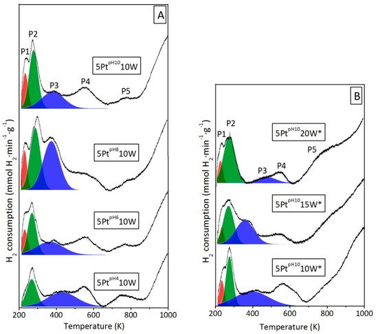 H2-TPR profiles for different Pt/WOx/Al2O3 catalysts. Effect of the Pt impregnation pH (A) and the W impregnation pH (B). The * symbol refers to the pH value of 1.5 during tungsten impregnation.