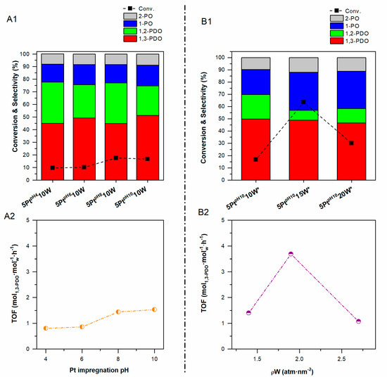 Performance of Pt-WOx/γ-Al2O3 catalysts in glycerol hydrogenolysis. Left: Effect of the Pt impregnation pH on glycerol conversion and product selectivity (A1), and on TOF1,3-PDO-W (A2). Right: Effect of the ρW on glycerol conversion and product selectivity (B1), and on TOF1,3-PDO-W (B2). Operating conditions: 473 K, 55 MPa H2, 5 wt.% glycerol water solution, 0.3 gcat·gglycerol−1, 4 h.