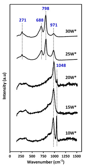 A series of WOx/γ-Al2O3 materials were prepared at pH = 1.5 and tungsten content between 10 and 30 wt.%. These materials are denoted as yW*, where ‘y’ refers to the W content and * to the pH value of 1.5 during the tungsten impregnation. Raman spectra of the calcined materials (see Figure 3) revealed that crystalline WO3 bands (ca. 800, 700 and 270 cm−1) [32] only appeared for tungsten loadings above 20 wt.%. Hence, by reducing the impregnation pH from 8.5 to 1.5, the ρWlim value almost doubled (1.3 vs. 2.7 at. nm−1), indicating that a low pH value limits the aggregation of well-dispersed tungsten oxide species. All the samples showed a band near 970 cm−1, which is attributed to the W = O vibration mode characteristic of mono- and polytungstate species [33]. Nonetheless, the intensity of this band was lower for those samples containing WO3 nanoparticles (i.e., 25W* and 30W*), which correlates with a lower proportion of polytungstates.