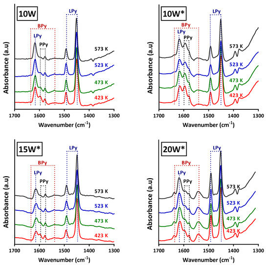 Measurements were taken in the whole spectrum range, using 200 scans and a 4 cm−1 resolution, although only results from the 1700–1300 cm−1 region, where Lewis and Brønsted signals appear, are shown (Figure 4).