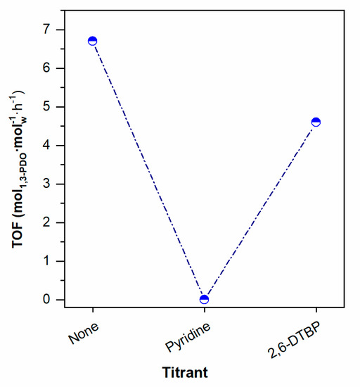 In order to clarify the role of Brønsted and Lewis sites, activity tests for glycerol hydrogenolysis were carried out, adding in situ titrants, such as 2,6-di-tert-butyl-pyridine (which only adsorbs on Brønsted sites) and pyridine (which adsorbs on both Brønsted and Lewis sites). In each experiment, 0.20 mmol of titrant was added, which was, in principle, sufficient to titrate the 0.13 mmol of acid sites present in 0.15 g of catalyst (estimated from TPD-NH3 measurements). As observed in Figure 5, no 1,3-PDO formation was observed when pyridine was used as the titrant, which means that Lewis acid sites are mandatory for the formation of the α,ω-diol. Notably, significant 1,3-PDO production was measured when adding 2,6-di-tert-butyl-pyridine, and the TOF1,3-PDO-W was only reduced by less than one third (ca. 30%) compared to the activity test with no titrant. Hence, under our reaction conditions, 1,3-PDO could be obtained even in the absence of Brønsted sites in the catalyst.
