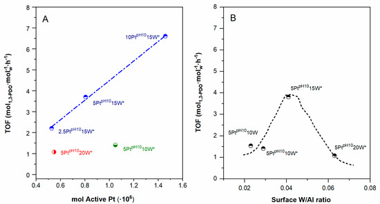 For this series, the Pt dispersion decreases with increasing loading from 2.5 to 5 wt.%, and then it remains stable (Table 1, entries 6, 8 and 9). The activity tests with these catalysts were carried out at different reaction times (1–4 h) in order to obtain similar glycerol conversion values (15–22%) for all the catalysts. At these conditions, secondary hydrogenolysis conditions, leading to 1-propanol and 2-propanol, are minimized. As observed in Figure 6A, the TOF1,3-PDO-W increases linearly with the amount of active Pt in the catalysts, for materials with the same 15W*/γ-Al2O3 support. Hence, for the same ρW, which means a similar type and amount of polytungstates, the catalyst activity towards 1,3-PDO and the Pt dispersion are directly related. On the contrary, if we compare the TOF1,3-PDO-W and the amount of active Pt for catalysts with different ρW (Figure 6A), the linear relationship is lost. In fact, the 2.5PtpH1015W* catalyst presents a slightly lower amount of Pt sites than the 5PtpH1020W*, but its TOF1,3-PDO-W is almost twice as high. These results indicate that the tungsten oxide active sites are different for catalysts with different ρW, even if no WO3 nanoparticles are formed. Moreover, the nature of these tungsten species has a higher influence on 1,3-PDO production than the amount of Pt sites (or Pt dispersion for catalysts with the same Pt content). The latter is only relevant for catalysts with the same tungstated support.