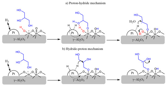 For a better understanding of the nature of the active sites, it is convenient to focus on the reaction mechanism. It is widely accepted that the formation of 1,3-PDO from glycerol occurs through a direct hydrogenolysis mechanism in which the first step is the adsorption of glycerol on a polytungstate site to form a primary alkoxide. After this step, previous works [5,17] suggest a proton → hydride mechanism (Scheme 1a). A carbocation is formed after the protonation–dehydration of the secondary hydroxy group. Next, a hydride generated on a nearby platinum site attacks this secondary carbocation and releases the target product.