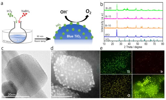 A schematic of the synthesis of IrO2−blue TiO2 NPs in the presence of NaBH4 as a reducing reagent is shown in Figure 1a. The samples with different ratios of Ir4+ precursor to pure blue TiO2 (BTO) are denoted as BI−10, BI−15, and BI−20. After the addition of NaBH4, the formation of IrO2 (101) on blue TiO2 was verified by powder X-ray diffraction studies, which determines the peak position of 2θ at 34.8°, as identified by standard ICSD #84577−IrO2) [,], while all samples maintained the anatase peaks as in the original XRD blue TiO2 nanoparticles (Figure 1b). Transmission electron microscopy (TEM) of the BI-15 NPs showed a nanostructure consisting of blue TiO2 NPs (20–30 nm size) with uniform dots on the surface (Figure 1c). Furthermore, high-angle annular dark-field scanning transmission electron microscopy (HAADF-STEM) was checked to clearly confirm that the distribution and interconnection of IrO2 clusters by the bright spots, with sizes between 1 and 2 nm on the blue TiO2, [,].and energy-dispersive X-ray spectroscopy (EDS) elemental mapping results support the distribution of Ti, Ir, and O (Figure 1d). The Ir element detected on blue TiO2 components is contacted on BI−15 NPs, and no significant impurities were detected.