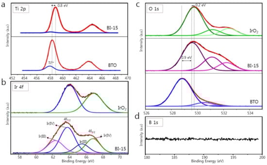 XPS analysis of BTO, IrO2, and IrO2-BTO samples: (a) Ti 2p spectra; (b) Ir 4f spectra, (c) O 1s spectra, and (d) B1s spectra.