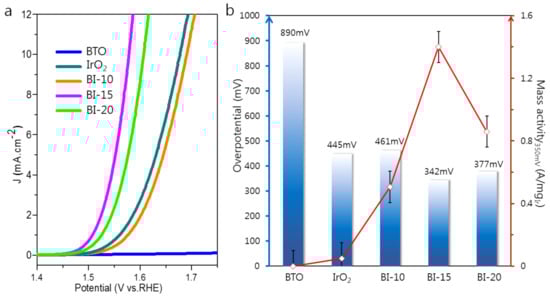 Electrochemical characterization was performed to investigate the activities of the catalysts. We then continued to investigate the morphology-driven shifts in OER catalytic performance by evaluating the electrocatalytic activity in 0.1 M HClO4 with an O2-saturated state at ambient condition. Electrochemical impedance spectroscopy of all catalysts was recorded for iR correction before measuring. From the linear sweep voltammetry (LSV) curves (Figure 3a), the performance of the electrocatalyst for the OER was measured at a slow scan rate of 5 mV·s−1 within the high anodic potential of 1.2−1.8 V vs. RHE after iR correction. All of the as-prepared catalysts with a RuO2 as a point of reference electrocatalyst were tested. Among these samples, the BI−15 catalyst exposed the impressive OER efficiency with the lowest overpotential of 342 mV vs. RHE, which is even less than pure IrO2 catalyst (445 mV), drive at the current density of 10 mA·cm−2. Comparison of the overpotentials of various samples exhibited a relationship of BTO > BI-10 > IrO2 > BI-20 > BI−15, suggesting that the IrO2 species on BTO are active sites for electrocatalytic OER. Another possible explanation may be that due to the nucleophilicity that occurred on the Ir−O ligand, rapid O−O bond generation can explain for exceedingly enhanced OER efficiency of the IrO2−BTO catalyst with a low kinetic barrier during electrocatalysis [,]. Moreover, on the Ir surface have referred the rich electron density due to strong interaction with the BTO (as shown in the XPS analysis spectra) also acts an important role in the promoted electrocatalytic effect of the BI−15 catalyst [,,].