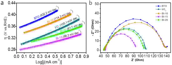 (a) Tafel slopes of BTO, IrO2, BI−10, BI−15, and BI−20 electrodes. (b) Electrochemical impedance spectrogram of BTO, IrO2, BI−10, BI−15, and BI−20 electrodes at the potential of 1.27 V, conducted before OER testing.
