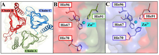 The γ-CA from the ubiquitous bacterium Escherichia coli (EcoCA-γ), which has two crystal structures with Protein Data Bank (PDB) IDs of 3TIO and 3TIS, emerged as the first γ-CA to possess an active site capable of alternating between a “closed” state and an “open” state [18] (Figure 1), an occurrence common in β-CAs [19,20,21,22]. This switch in EcoCA-γ is made possible by a His residue responsible for the shuttling of a proton from the Zn-bound water molecule during catalysis. The residue is positioned close to the catalytic site on a loop that is 11 residues long. The His residue occasionally coordinates the Zn2+, obstructing the active site opening, as shown in Figure 1C.