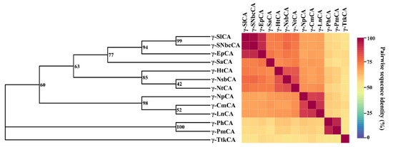 Phylogenetic tree constructed for γ-CA sequences from hydrothermal vent organisms alongside the pairwise sequence identity heatmap. The maximum likelihood method was applied using the LGG protein model with 100% gap deletion, and the bootstrap values are displayed as percentages of 1000 bootstraps on the branch nodes.