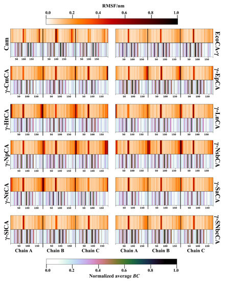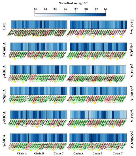 This section aimed to analyze residue fluctuation patterns during the simulations as well as to utilize BC in discovering residues important in protein communication. On account of the inverse relationship between BC and RMSF [39], these two metrics were jointly plotted together for all the γ-CAs as heatmaps in Figure 4. Generally, the trimeric structures showed high levels of rigidity. This was expected given the abundance of beta sheets in the prisms. Highly flexible regions (shown by the darker regions) were observed in the termini mostly for the γ-CAs γ-HtCA, and γ-NpCA as well as γ-NsbCA. They were also observed in the N-termini of Cam, γ-EpCA, as well as both termini in all chains of EcoCA-γ, γ-SlCA, and γ-SNbcCA. The loop containing the proton-shuttling His residue (seen by the darker regions between residues 50 and 100) had distinctly high RMSF values in all the γ-CAs. All the flexible regions mentioned predictably coincided with low average BC regions. Residues that have a high average BC (shown by the darker regions in the average BC heatmaps) are known to be central in the residue network and have a considerably high amount of communication through them. Those with high fluctuations are not capable of functioning as a continuous central point in the network, thus they normally exhibit low average BC values. However, flexibility is a prerequisite for the operation of some functional residues, such as the proton-shuttling His in CAs. After narrowing down to the 5% residues with the highest average BC in each protein, these residues were plotted as heatmaps (Figure 5). As expected, His67 was not part of the list for all the proteins. Some functionally important residues, however, were identified. Most of these were identified in Section 2.2.1 as residues in the interface, highlighted in green and a considerable number were hotspot residues, highlighted in red. One or more Zn2+-coordinating histidines (shown by the yellow dots, Figure 5) were observed as high communication residues across all γ-CAs, with the highest number being observed in EcoCA-γ. CO2-binding pocket residue Met107, which was a hotspot residue in some γ-CAs, also had high average BC values. Overall, the functions of most high BC residues were successfully annotated and correlated to low fluctuating residues.