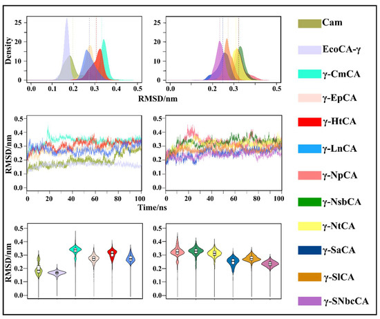 Root mean square deviation (RMSD) kernel density estimation (KDE) plots (top), line plots (middle), and violin plots (bottom) of γ-CAs simulated. The mean RMSD for each γ-CA is depicted as a similar colored line to the KDE plot and as a black line in the violin plots.