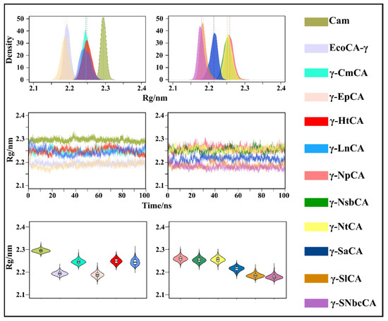In order to monitor the conformational changes that occur in the γ-CAs during the MD simulations, radius of gyration (Rg) and root mean square deviation (RMSD) analyses were utilized and are represented using three different types of plots in Figure 6 and Figure 7. Monitoring the evolution of these metrics using line graphs was done in order to observe when the structures attained equilibrium during the simulation as well as to see any distinct changes in Rg and RMSD. KDE and violin plots were plotted to view the distribution of structures with different Rg and RMSD values across the simulations. All γ-CAs from hydrothermal vents showed a stable RMSD, which was equilibrated for most of the simulation. This was anticipated at this temperature given that the hydrothermal vents they come from are high-temperature environments. Interestingly, the RMSD line graph for Cam showed a significant increase at 75 ns and then equilibrated up to 100 ns. Cam is moderately thermostable showing stability up to 55 °C [28]. However, unlike these organisms, E. coli is a mesophilic bacterium, but EcoCA-γ was observed to exhibit the most stable RMSD compared to the rest of the structures. Compactness was well-maintained for the γ-CAs throughout the simulations. The observations for both Rg and RMSD were expected due to the rigidity of the trimeric structures.