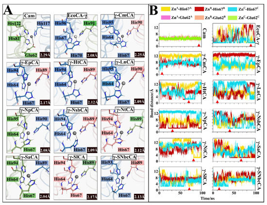 Zn2+ coordination by a proton-shuttling residue. (A) Visualized frames of each γ-CA showing the fourth coordination position being fulfilled by His67 (Glu62 for Cam). Residues from chain A are highlighted in salmon, chain B in blue, and chain C in green. Zn2+ is shown as a grey sphere and the Zn-His (Zn-Glu for Cam) distance is indicated in the black box in the bottom right corner of each structure. (B) Bond distances between Zn and the proton-shuttling residue across the 100 ns trajectories. The red triangle shows the frame from which the respective structure in (A) was obtained.