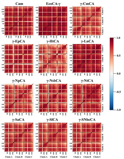 Dynamic cross correlation (DCC) heatmaps for γ-CAs simulated.