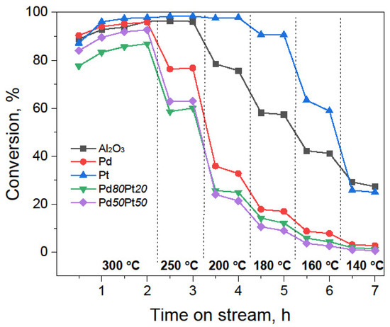 Pd/Al2O3, Pt/Al2O3 and two bimetallic Pd-Pt/Al2O3 samples were tested in the reaction of CHClF2 with hydrogen in a relatively short preliminary kinetic runs after catalysts reduction at 400 °C for 17 h. The results of these investigations are presented in Figure 1 and Figure 2. Bearing in mind that the desired high rate of CHClF2 dismutation on the alumina support is obtained after its halogenation at higher temperatures [6,7], our experiments began with a high temperature, i.e., 300 °C. After obtaining a relatively constant conversion of CHClF2 (within ±10%) at 300 °C, the reaction temperature was gradually decreased to 140 °C.