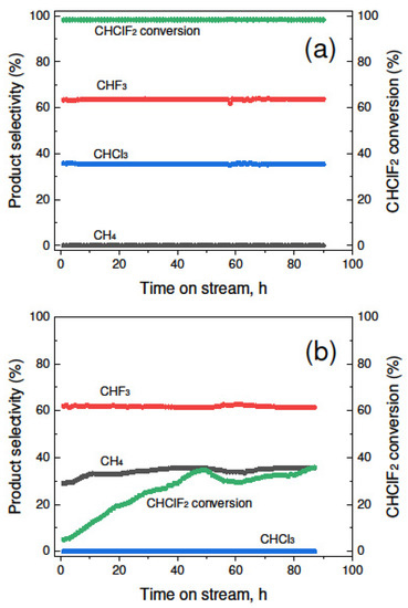 On the other hand, Figure 3b shows an activation of the Pd/Al2O3 catalyst which reaches stable behavior after ~50 h at 180 °C. The increase in the dismutation activity must be linked to a gradual halogenation of alumina. It means that the values of CH4/CHF3 quotient higher than 0.5 shown in Figure 2 result from support fluorination rather than from direct CHClF2 hydrodechlorination (to CH4) on Pd sites. This conclusion is supported by the finding that essentially only CH4 and CHF3 were found in products indicating that dismutation proceeds significantly faster than HDC since otherwise also CH2F2 and CH3F should be present.