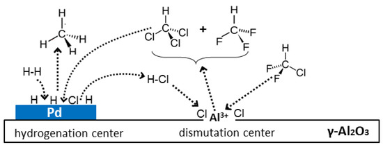 Dual-function mechanism of hydrodechlorination of CHClF2 on Pd/Al2O3 catalysts.