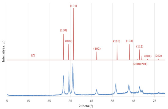 XRD diffraction pattern obtained for a ZnO sample prepared by Synthesis 1 (Z13—blue line), as compared to a wurtzite reference (JCPDS 36-1451) diffraction spectrum (Z—red line).