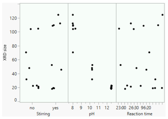 In order to study the influence of the three tested parameters (pH, stirring, and reaction time) in this synthesis 1 protocol (Table 1), a statistical analysis was performed using the JMP® Pro 15 software. It was chosen to work with crystallite sizes that were determined from XRD patterns, rather than size measured on TEM images. Indeed, the approximations of the Scherrer equation, as described in Equation (1), would have impacted all the size values in the same way, while it was difficult to precisely measure the NP size on TEM images, due to their agglomeration in bigger particles, and to anisotropy. To visualize the relationships between the three tested parameters and the dXRD response, a scatter plot was drawn (Figure 3) for the 18 ZnO experiments. A marked correlation between pH and dXRD is appreciated in Figure 3 (middle), while stirring and reaction time do not seem to influence the dXRD obtained.