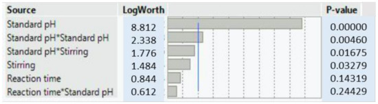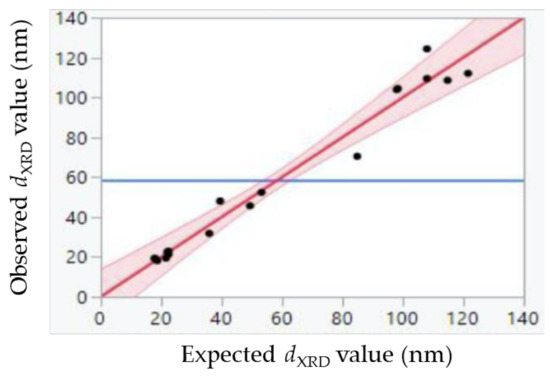 Figure 4 is a plot of the obtained dXRD, using the Scherrer formula to identify the dXRD values expected by the built model. The adjustment summary is gathered in Table 3. The R2 is equal to 0.97, meaning that 97% is explained by the built model, which is therefore relevant. The analysis of variance report (Table 4) provides the calculations for comparing the fitted model to a model where all the predicted values are equal to the response mean (58.5578 nm). The degree of freedom is the number of parameters implemented to fit the model. This degree is equal to six for the model, for the following parameters: pH, stirring, reaction time, pH * pH, pH * stirring, and pH * reaction time. The parameters (stirring * reaction time) and (reaction time * reaction time) were not implemented here. An analysis including these two additional parameters was also performed (see Figures S3 and S4, and Table S1 in Supplementary Materials). Nevertheless, the LogWorth of the pH was lower and the error sum of squares was higher, which means that the model explained less than the analysis performed with less parameters.