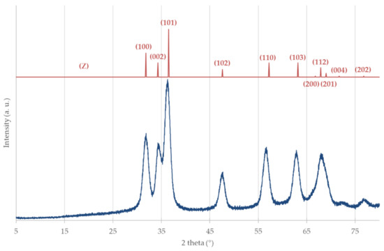 The collected diffraction peaks (Figure 6) are in very good agreement with the wurtzite reference (JCPDS = 36–1451). The dXRD calculated by the Scherrer equation, using the (102) peak plane as well, is equal to 8 nm (Table 5).