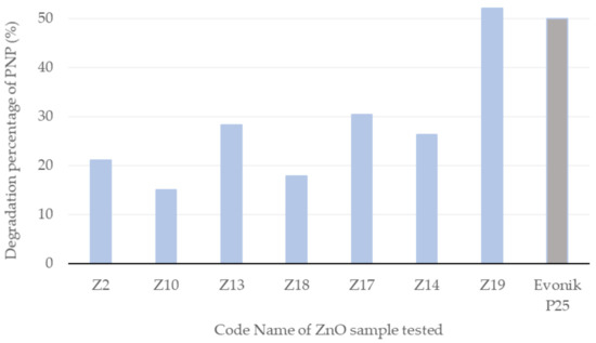 The best results were obtained with Z19 (DPNP = 52%), which presented the smallest particle sizes. The second highest PNP degradation percentage (DPNP = 30%) was connected to the Z17 sample, whose particle size (9 nm) was similar to that of Z19, but these were agglomerated into bigger particles (203 nm), as can be appreciated from Figure 2e. The descending DPNP order for the other ZnO samples tested approximately followed the order of the NPs size, as follows: Z13 (20 nm) > Z14 (30 nm) > Z2 (29 nm) > Z18 (37 nm). The sample that provided the lowest PNP degradation rate was Z10. Indeed, as shown in Figure 2b, the morphology of the ZnO structure in this case is long and tubular. The best photocatalyst (Z19) has similar activity to commercial Evonik P25 (~50% after 7 h). It is important to be reminded that this commercial photocatalyst is made by a high-temperature aerosol process [22], while the ZnO samples presented here are made at low temperature, without a calcination step.