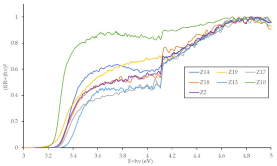 Determination dy DRUVS of the direct band gap energy for the seven ZnO samples tested in photocatalysis.