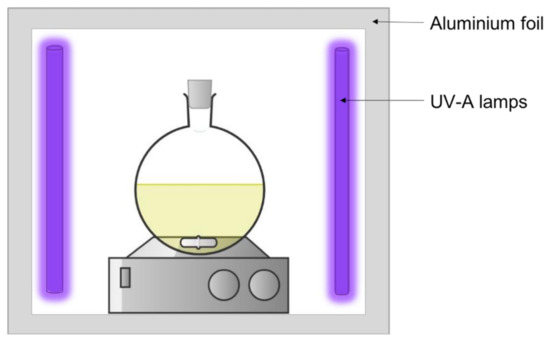 In a quartz sealed round-bottom flask (Figure 12), 10 mg of each ZnO NPs were suspended in 10 mL of a PNP aqueous solution (1 × 10−4 mol·L−1). The solutions were stirred and irradiated with two UV-A lamps (TL Mini Blacklight Blue, TL 8W BLB 1FM/10 × 25CC, λmax = 370 nm, Philips, Amsterdam, The Nederlands). The best sample was also irradiated with four lamps. Aluminum foil was used to cover the outer wall of the reactor and prevent any side reactions with ambient light. A 2 mL sample was taken after 7 h of exposure to UV-A. ZnO catalysts were filtered off with a syringe filter (polypropylene, 13 mm diameter, 0.2 μm pore size, Whatman™, Maidstone, UK). The concentration of PNP was measured by UV/Vis spectroscopy (1700 UV/visible spectrophotometer, Shimadzu) at 317 nm, which correspond to the acidic form of PNP. Previously, a calibration curve was made for the PNP acidic form. Previously, a control experiment was performed to assess if PNP does not undergo direct photolysis under this ultraviolet A (UVA) illumination.