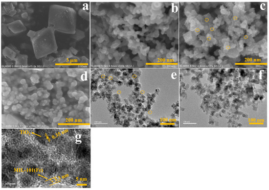 Figure 2. SEM images of MIL-101(Fe) (a) and TiO2 (b); SEM images of the MOF precursor/TiO2 (c) and MIL-101(Fe)/TiO2 (d); (e) TEM images of MOF precursor/TiO2 and MIL-101(Fe)/TiO2 (f); (g) High-resolution TEM image of MIL-101(Fe)/TiO2.