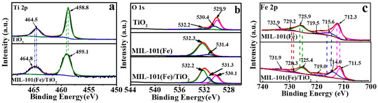 Figure 3. (a) High-resolution of Ti 2p spectra of TiO2 and MIL-101(Fe)/TiO2; (b) High-resolution of O 1s of various photocatalysts; (c) High-resolution of Fe 2p of MIL-101(Fe) and MIL-101(Fe)/TiO2.