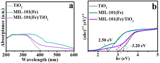Figure 8. (a) Photocurrent of MIL-101(Fe) and MIL-101(Fe)/TiO2 catalysts under UV irradiation; (b) Typical Mott–Schottky plots of MIL-101(Fe).