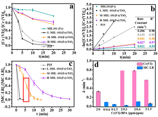 The photocatalytic performance of MIL-101(Fe)/TiO2 over Cr(VI) reduction was investigated systematically. Figure 5a shows that the removal curve of Cr(VI) using over various catalysts under UV irradiation. The adsorption of Cr(VI) in the dark can be neglected using different photocatalysts. Bare MIL-101(Fe) exhibited the lowest removal efficiency of Cr(VI) (0.011 min−1). It was also obvious that the introduction of TiO2 into MOF(Fe) resulted in higher Cr(VI) reduction rates (Figure 5b) which indicated that the photocatalytic behavior of bare MIL-101(Fe) could be enhanced by coupling it with the semiconductor particle P25 due to the high charge transfer via heterojunction. To investigate the influence of the MOF (Fe) proportion on the photocatalytic degradation efficiencies of Cr(VI) and MC-LR, three MIL-101(Fe)/TiO2 composites with low, medium and high content MIL-101(Fe) were synthesized by regulating the amounts of Fe3+. Accordingly, we name the as-prepared MIL-101(Fe)/TiO2 as L-, M- or H-MIL-101(Fe)/TiO2, respectively. Compared with the rate constant of the bare TiO2 (0.129 min−1), L-MIL-101 (Fe)/TiO2 exhibits the highest removal content and rate. The removal efficiency reaches to 100% within 20 min irradiation. Results also showed that the removal efficiency of Cr(VI) was inversely proportional to MOF (Fe) content in MIL-101(Fe)/TiO2. The corresponding rate constants were 0.306 min−1, 0.031 min−1 and 0.027 min−1 for L-, M-, and H-MIL-101(Fe)/TiO2, respectively (Figure 5b). The reason for this might be attributed to the excess of MIL-101(Fe) within composites will block TiO2, restricting the availability of light and the electron migration.