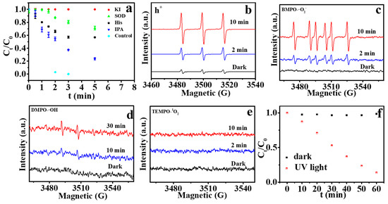 Using the ESR spin-trap technique with various probes [50,51,52], reactive species involved with the photocatalytic degradation were further confirmed in MIL-101 (Fe)/TiO2 catalyst suspensions. As shown in Figure 7b,c, both the h+ and •O2 signals were discerned using a probe of 1-hydroxy-3-carboxy-2,2,5,5-tetramethylpyrrolidine (CPH) and 5-tert-butoxycar-bonyl 5-methyl-1-pyrroline N-oxide (BMPO) respectively, and their intensities increase obviously after 2 min of irradiation. 5,5-Dimethyl-1-pyrroline-N-oxide (DMPO) was used as an •OH probe was using to verify the direct generation of •OH [50]. The signal strength of •OH was relatively weak even after 30 min irradiation (Figure 7d). 2,2,6,6-tetramethylpiperidine (TEMP) as a probe of 1O2, has a characteristic peak signal of 1:1:1 [53]. However, there was no TEMP-1O2 signal (Figure 7e), which may be attributed to the small amounts 1O2. Furfuryl alcohol (FFA) is also a specific probe for 1O2 [54]. Thus, the degradation of 0.2 mM FFA was also carried out to confirm the existence of 1O2. Figure 7f shows that the content of FFA decreases diagonally within 60 min, with 16% left at the end, suggesting that the reaction of 1O2 with FFA occurred. As a final result, h+, •O2 and 1O2 were the main involved reactive species in the MIL-101 (Fe)/TiO2 suspensions, which is consistent with the MC-LR degradation quenching experiments.