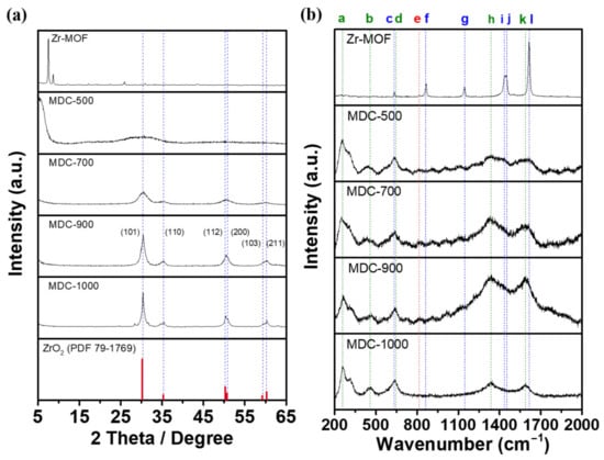 (a) XRD patterns and (b) Raman spectra of Zr-MOF, MDC-500, MDC-700, MDC-900, and MDC-1000.