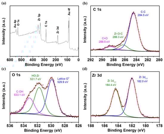 X-ray photoelectron spectroscopy (XPS) was utilized to analyze the elemental composition and chemical bonding on the surface of materials. To find the possible reasons why MDC-900 possesses superior electrochemical activity, the survey and narrow scan spectra of XPS were performed in Figure 5. As observed in Figure 5a, the zirconium, carbon, oxygen, and gold peaks were identified. Except for gold which was used to enhance the conductivity of samples during XPS characterization, other elements in the survey correspond with the results of TEM elemental mapping. For the narrow scan spectrum of C 1s, the bonds of C–C, Zr–O–C, and C=O appeared at 284.5, 286.3, and 288.5 eV, respectively (Figure 5b) [36]. The peak of C–C bond showed larger full width at half maximum (FWHM), and the reason could be the dangling bonds with different orientations distributed on the edge of graphitic structure [37]. The signal of C=O bond indicated that some oxygen functional groups grafted on the carbon structure of MDC-900, which might be served as the active sites. A new Zr–O–C bond confirms that the ZrO2 particles are attached strongly to the carbon material, significantly facilitating the vanadium redox couple reaction [15]. In the O 1s spectrum, the lattice O2− could be found because of the formation of tetragonal ZrO2 crystallites after sintering at 900 °C. At the binding energy of 531.7 and 533.1 eV, the existence of HO-Zr and C–OH bonds displayed that the hydroxyl groups were proved to be more electrochemically active sites for vanadium redox reactions (Figure 5c) [36,38]. For Zr 3d spectrum, two strong peaks of Zr 3d5/2 and Zr 3d3/2 were demonstrated at 182.0 and 184.4 eV, respectively, which resulted from the crystallites structure of tetragonal ZrO2 (Figure 5d) [36].