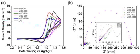 On the other hand, the peak separation of MDC-500 obtained after sintering at 500 °C increases significantly, and the disappearance of the reduction peak indicates insufficient catalytic activity. When the sintering temperature rises to 700 °C, the catalytic activity improves, and the optimum electrocatalytic activity is reached after carbonization at 900 °C. The essential factors for the activity improvement of MDC-900 sample might be the formation of tetragonal ZrO2 and graphite structure based on the XRD and Raman spectroscopy results, providing more active sites and better conductivity, respectively. In the previous study, Zhou et al. proposed that the hydroxyl groups on ZrO2 can be served as active sites to assist the electrochemical reactions of vanadium ions [39]. In our case, as ZrO2 is integrated with a graphite structure that has better conductivity, the synergistic effect between them might further improve the electron transfer from active sites to the electrode surface. However, if the sintering temperature further increases to 1000 °C, the peak current density decreased compared with that of 900 °C, and the reason can be the destruction of graphite structure that can bind with oxygen functional groups active sites provide good conductivity. On the negative side (see Figure S1), no matter whether Zr-MOF was carbonized or not, there is no oxidation peak for all samples. This suggests that all samples have poor catalytic activity towards the oxidation reaction of V2+ to V3+. The charge transfer resistances of all the catalysts were measured by electrochemical impedance spectroscopy (EIS). As shown in Figure 6b, the Nyquist plot often possesses a semicircle part and sloping straight line part in the three-electrode system, which implies the mixed-controlled process by charge transfer and diffusion steps [1,9]. By fitting with the equivalent circuit, some helpful information can be acquired, including the electrical conductivity. Rs represents the sum of the resistances of the electrolyte and the electrode. Since we use the same electrolyte, and the only difference is the catalysts on the electrode. In other words, if the catalyst had the highest electrical conductivity, the Rs resistance becomes the smallest one. Among the tested materials, MDC-900 has the lowest Rs resistance (3.84 ohm) comparing with those of Zr-MOF (4.48 ohm), MDC-500 (3.95 ohm), MDC-700 (5.53 ohm), MDC-1000 (4.23 ohm), which demonstrates that MDC-900 has the highest electrical conductivity relatively. The results almost correspond with that of the Raman spectra. MDC-900 has the lowest ID/IG ratio, suggesting more abundant in graphitic structure with better electrical conductivity.