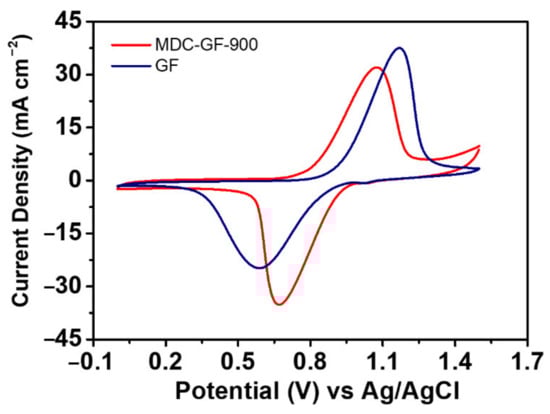 CV curves of MDC-GF-900 and pristine GF obtained at the scan rate of 5 mV s−1. The electrolyte was composed of 0.05 M VOSO4 plus 2.0 M H2SO4.
